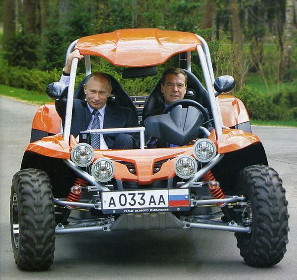 Президент Российской Федерации Д.А. Медведев управляет транспортным средством, а премьер-министр В.В. Путин — в качестве пассажира.