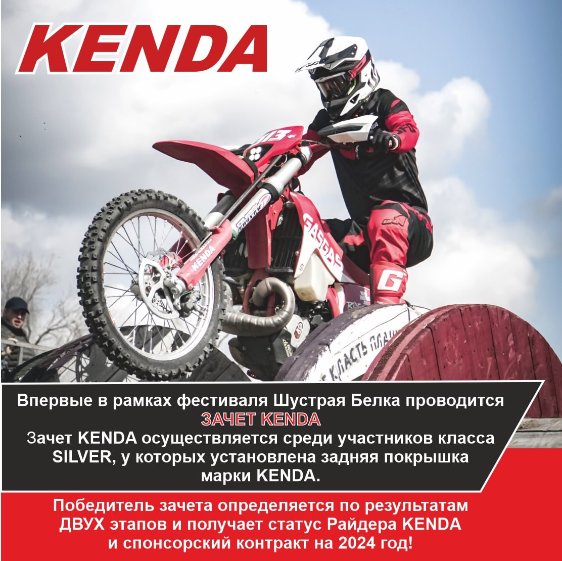 По итогам гоночного сезона Шустрая Белка 2023 лучшему атлету из зачета KENDA будет предложено подписать спонсорский контракт на 2024 год и обеспечить свой мотоцикл покрышками KENDA на весь гоночный сезон!